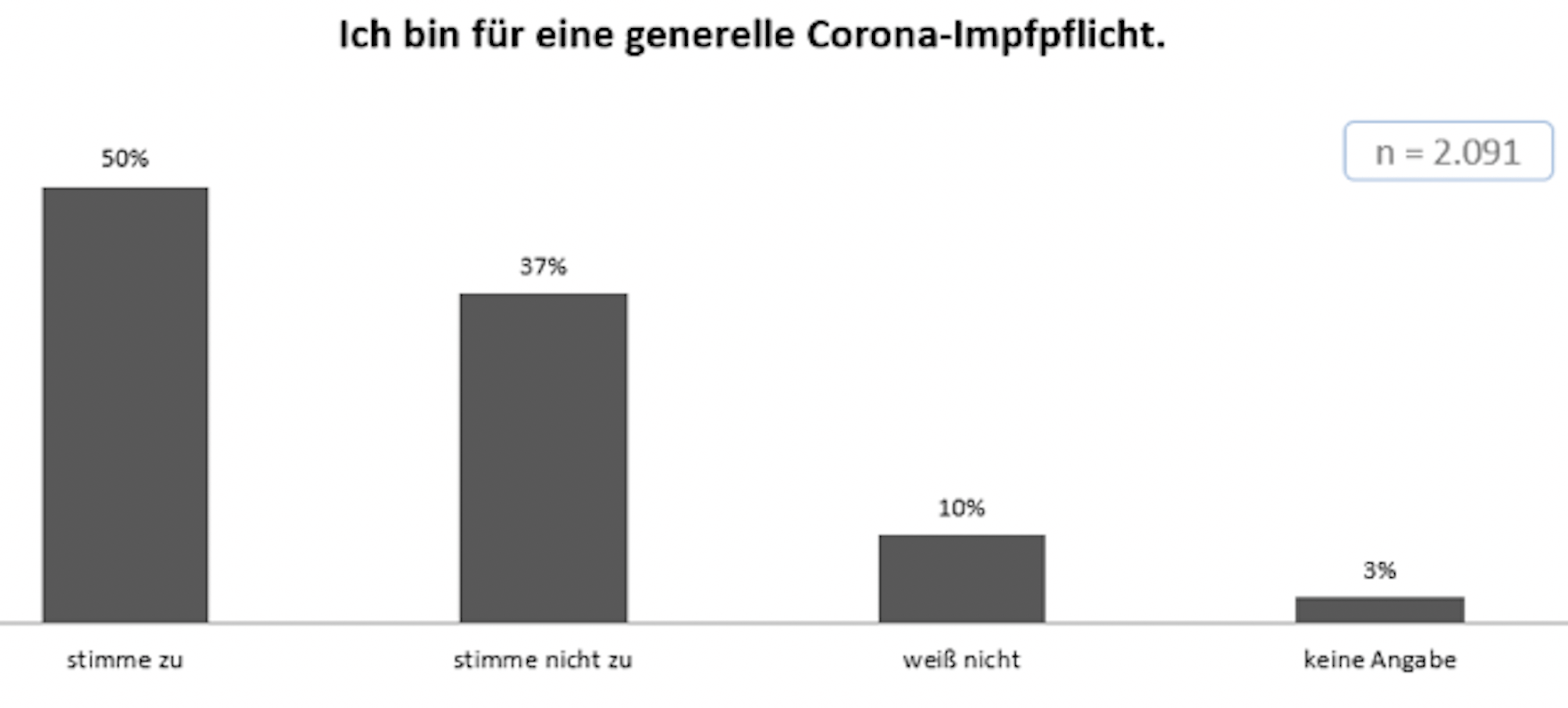 Jeder zweite Deutsche ist für eine generelle Corona-Impfpflicht. Das ergibt eine neue, repräsentative Umfrage des Meinungsforschungsinstituts INSA, das dazu 2.091 Menschen per Telefon befragte. Wie so oft bei Umfragen ist es eine Frage der Wertung, ob man das Glas als halbvoll oder halbleer betrachtet. Denn trotz einer Dauer-Propaganda in den Medien für die Impfung und regelrechter Gehirnwäsche, was deren angeblich exzellente Wirksamkeit und Alternativlosigkeit angeht, antwortet jeder zweite nicht, dass er eine Corona-Impfpflicht möchte. 37 Prozent sind aktiv dagegen, zehn Prozent antworten mit „weiß nicht“, drei Prozent machen keine Angabe.