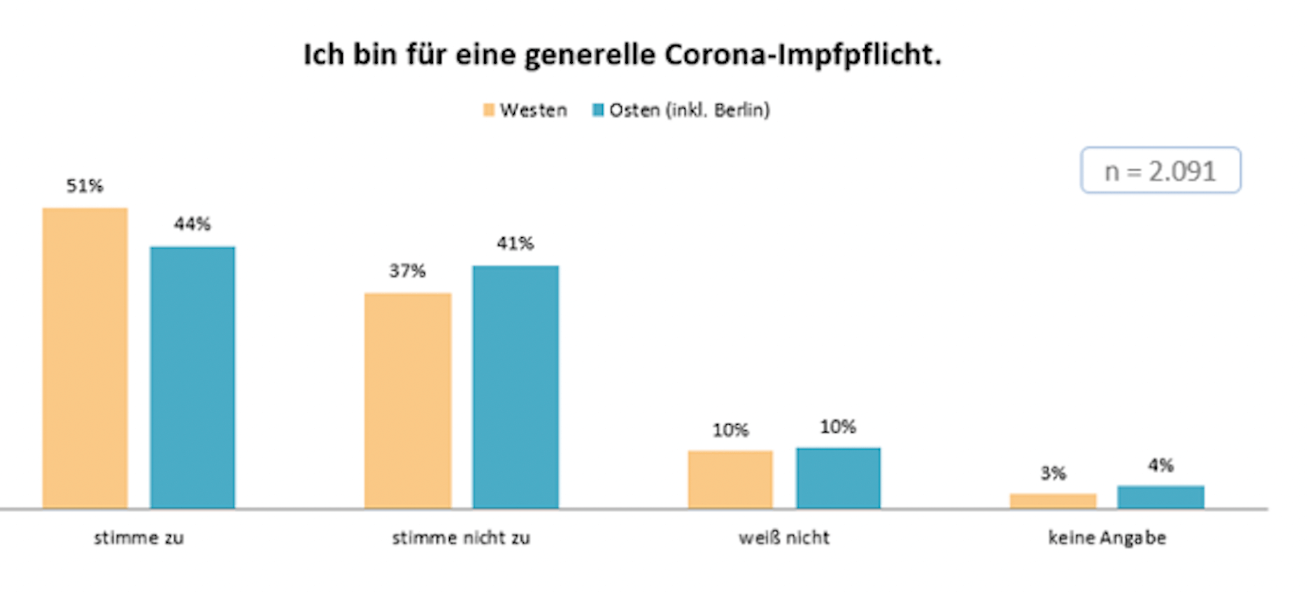 Die Befragten, die im Westen Deutschlands leben, sind häufiger für eine generelle Corona-Impfpflicht als diejenigen aus dem Osten (51 zu 44 Prozent). Im Osten halten sich aktive Befürworter und Gegner einer Corona-Impfpflicht fast die Waage (44 zu 41 Prozent).