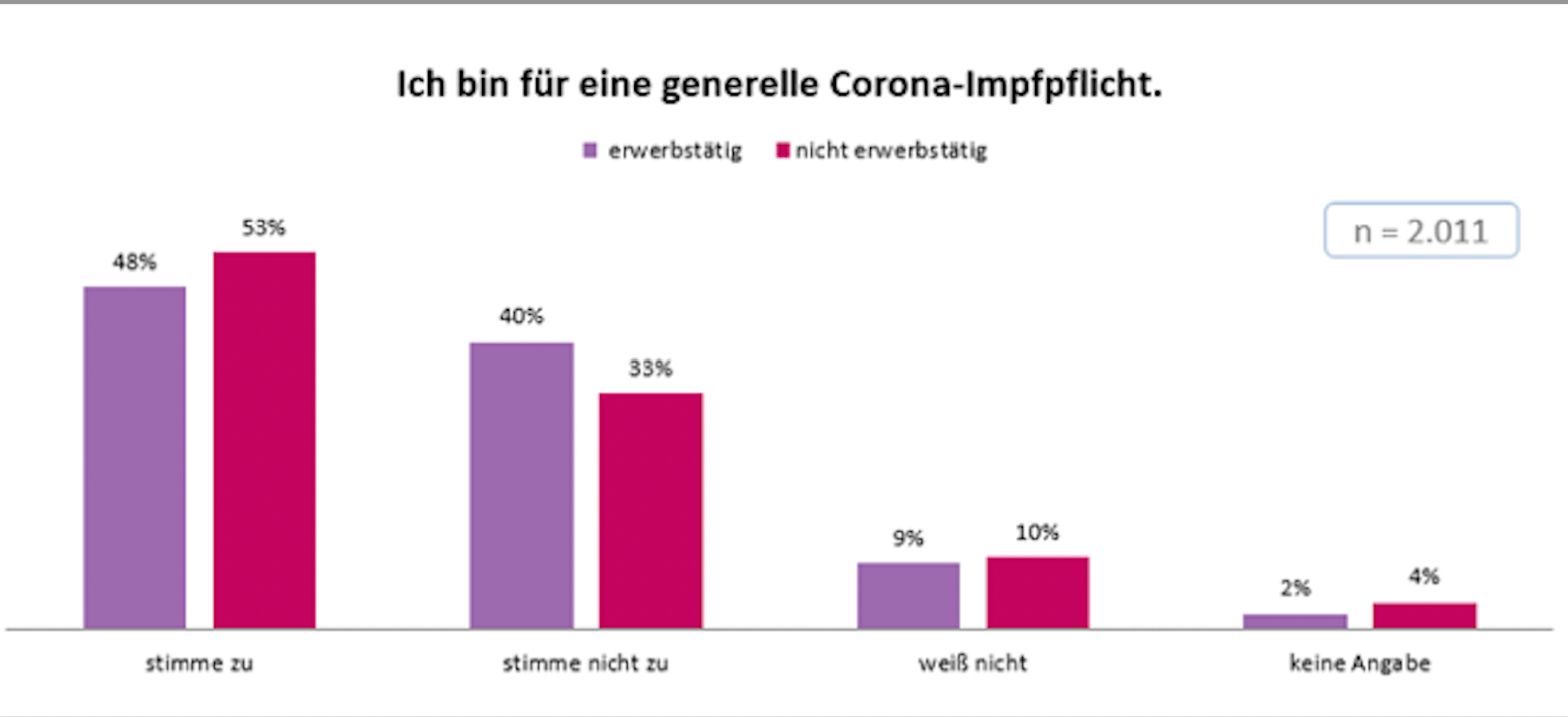 Befragte, die nicht erwerbstätig sind, sprechen sich etwas häufiger für eine generelle Corona-Impfpflicht aus als befragte Erwerbstätige (53 zu 48 Prozent). Bei beiden Gruppen überwiegt jedoch jeweils der Anteil derer, die hier zustimmen.