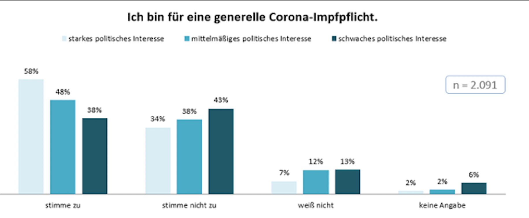 Mit dem politischen Interesse steigt der Anteil an Befragten, welche für eine generelle Corona-Impfpflicht sind von 38 Prozent bei denjenigen mit einem schwach ausgeprägten politischen Interesse auf 58 Prozent bei denen, welche sich stark für Politik interessieren, an. Einzig bei schwach politisch interessierten Befragten überwiegt der Anteil derer, die der Aussage nicht zustimmen (43 zu 38 Prozent).
