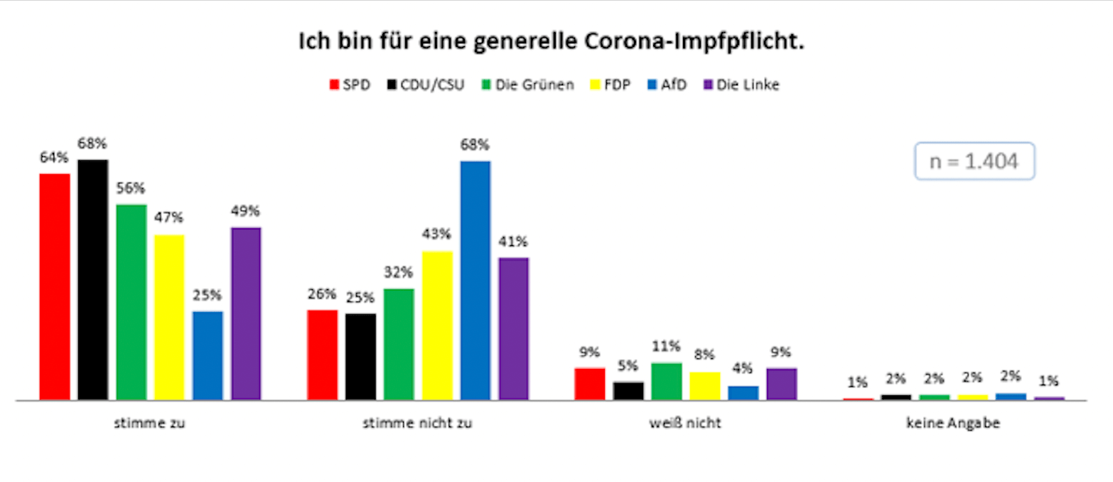Die AfD-Wähler lehnen eine generelle Impfpflicht mit 68 Prozent deutlich am häufigsten und als einzige Gruppe mehrheitlich ab (65 Prozent zu 25 bis 43 Prozent). Die Wähler der anderen Parteien sprechen sich jeweils zumindest relativ mehrheitlich für eine generelle Corona-Impfpflicht aus. Am höchsten liegt der Anteil mit 68 Prozent bei Unions-Wählern, gefolgt von SPD- (64 Prozent), Grünen- (56 Prozent), Linke- (49 Prozent) und FDP-Wählern (47 Prozent).