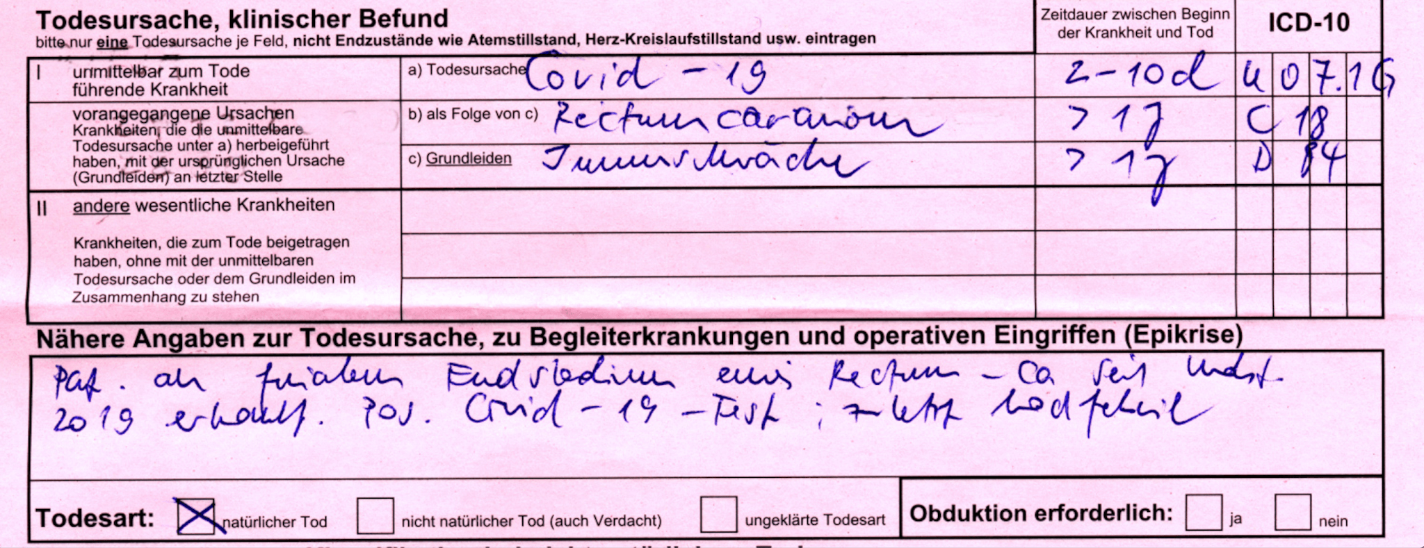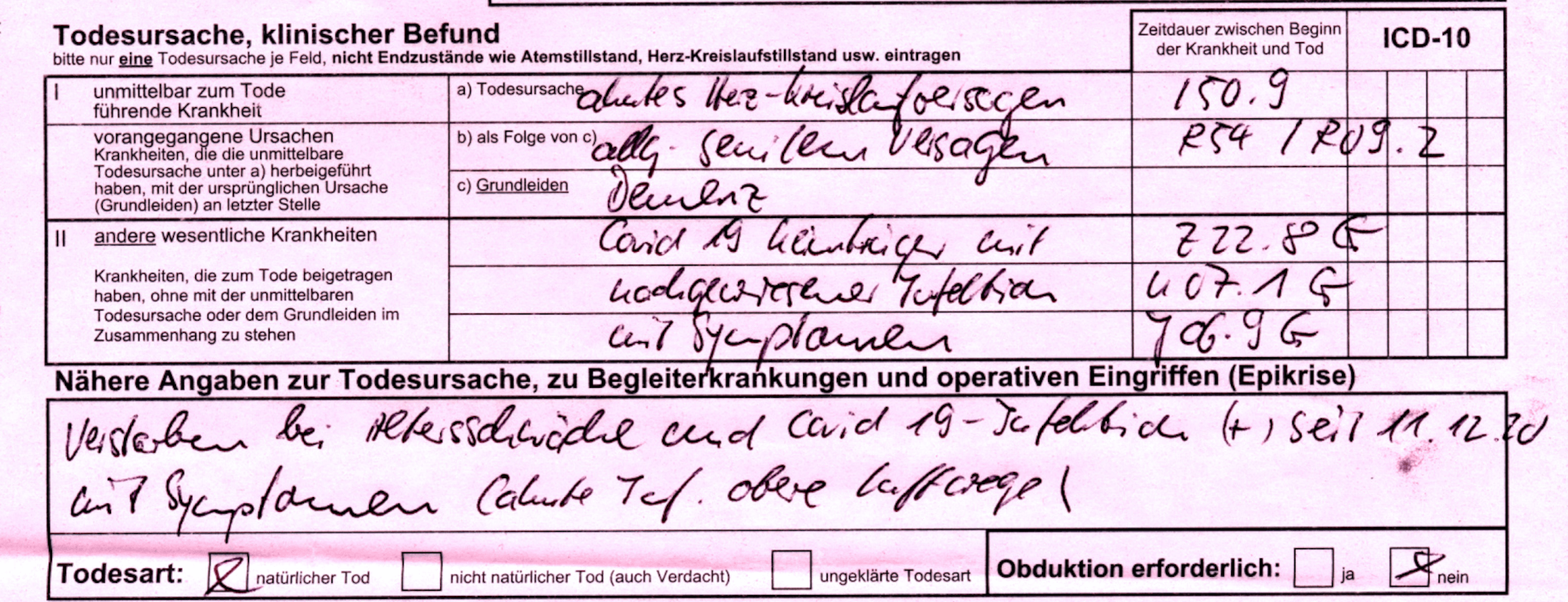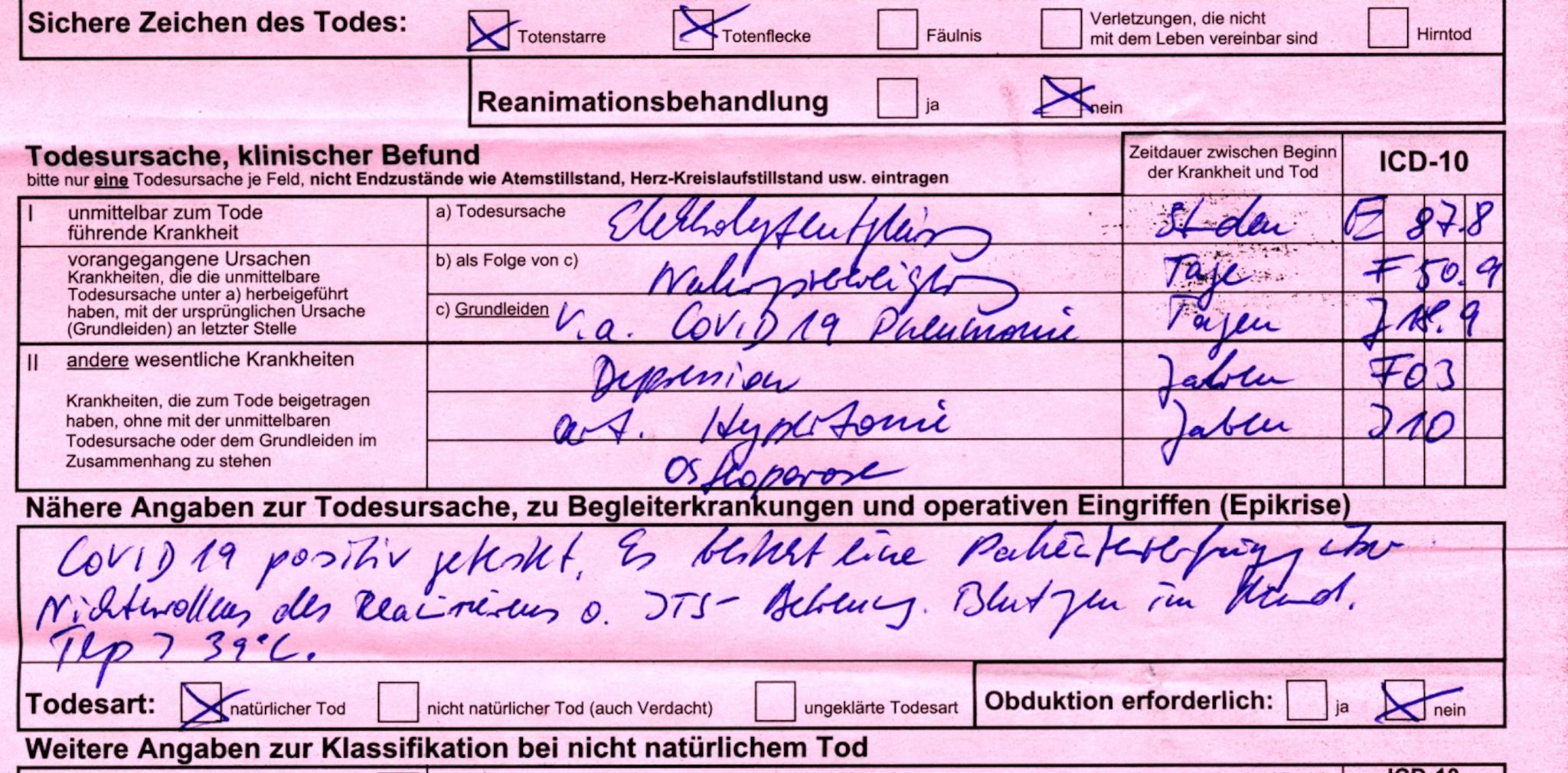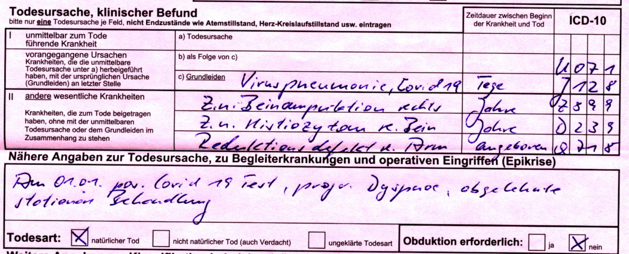 „Ich arbeite als Bestatter und die Totenscheine, zweimal rot und einmal blau, werden in der Häuslichkeit oder im Pflegeheim ausgestellt. Die aus den Krankenhäusern gehen direkt ins Standesamt. Ich benötige den blauen Totenschein, um die Sterbefallanzeige auszufüllen. Manchmal kann ich in die roten, nicht ganz legal, einsehen. Das sind die interessanten. Ich schicke heute noch mal einen mit. Bitte beachten, das Geburtsjahr, im Pflegeheim verstorben! Abschiednahme durch Verwandte und Pflegepersonal!! Kein Hinweis auf Infektion!!! Aber Covid-19.