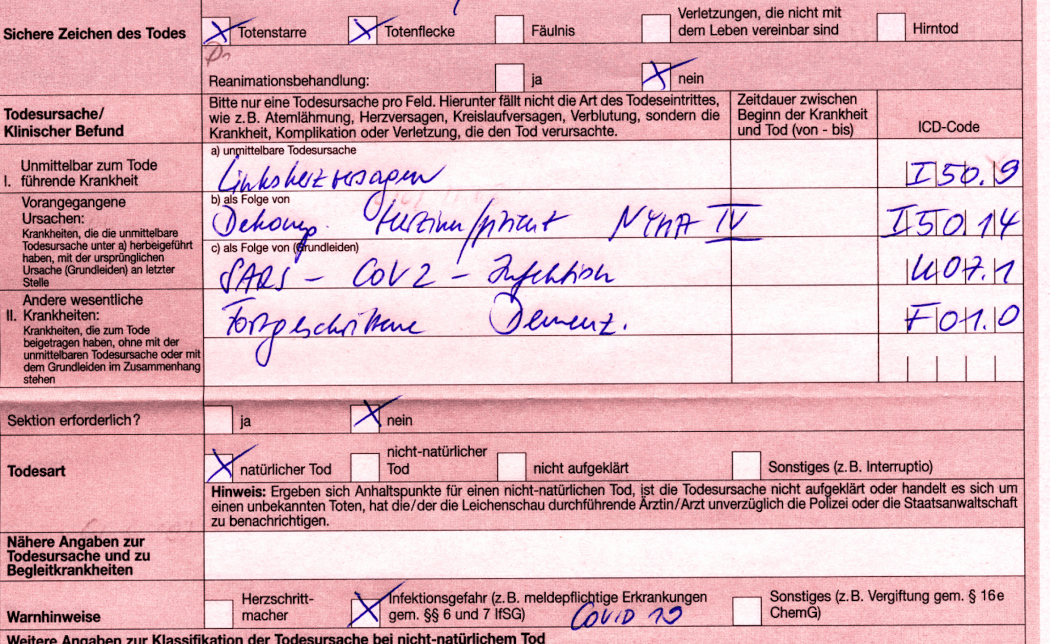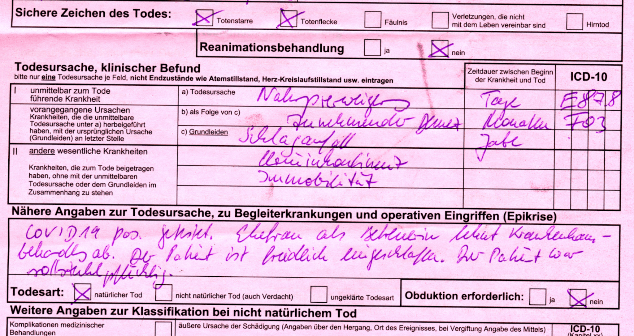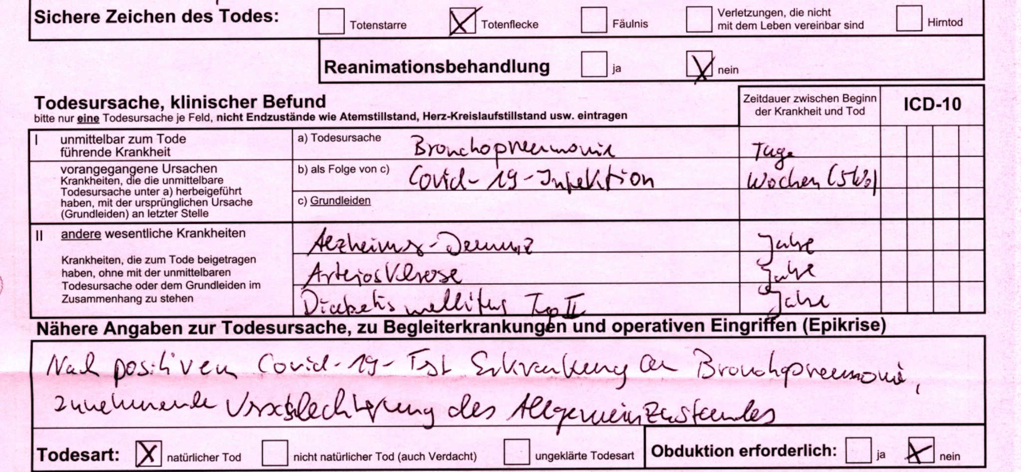„Ich arbeite als Bestatter und die Totenscheine, zweimal rot und einmal blau, werden in der Häuslichkeit oder im Pflegeheim ausgestellt. Die aus den Krankenhäusern gehen direkt ins Standesamt. Ich benötige den blauen Totenschein, um die Sterbefallanzeige auszufüllen. Manchmal kann ich in die roten, nicht ganz legal, einsehen. Das sind die interessanten. Ich schicke heute noch mal einen mit. Bitte beachten, das Geburtsjahr, im Pflegeheim verstorben! Abschiednahme durch Verwandte und Pflegepersonal!! Kein Hinweis auf Infektion!!! Aber Covid-19.