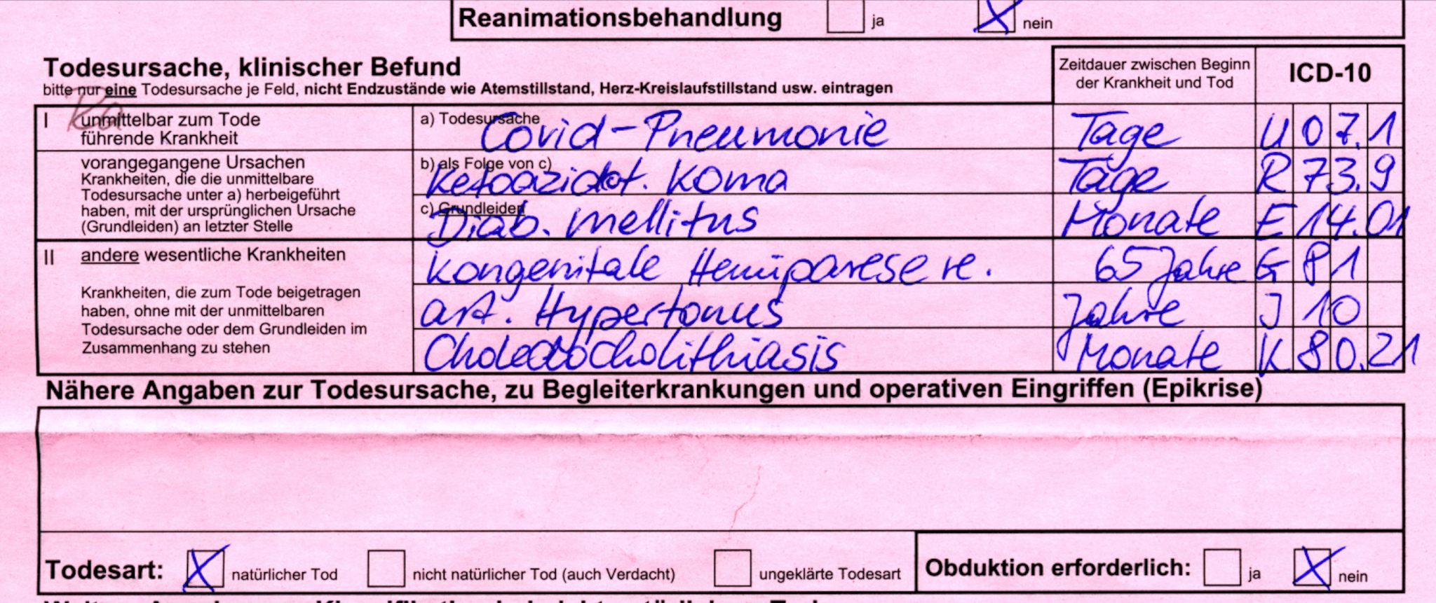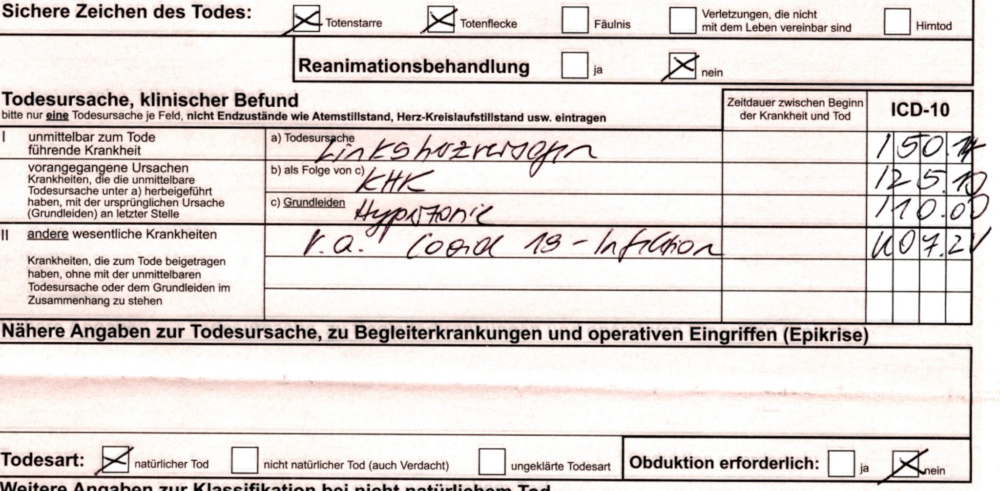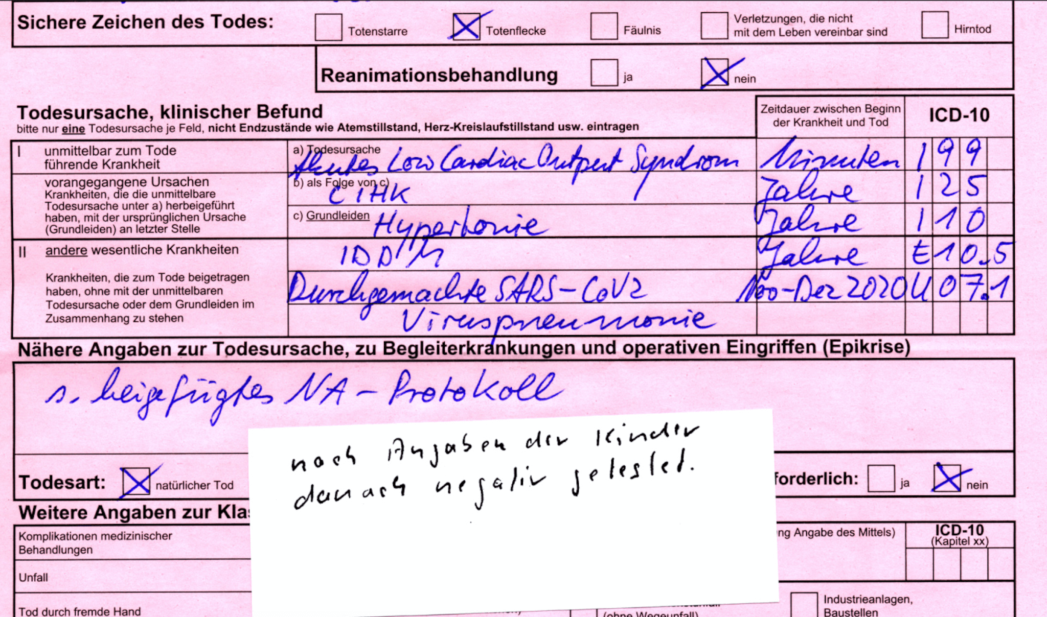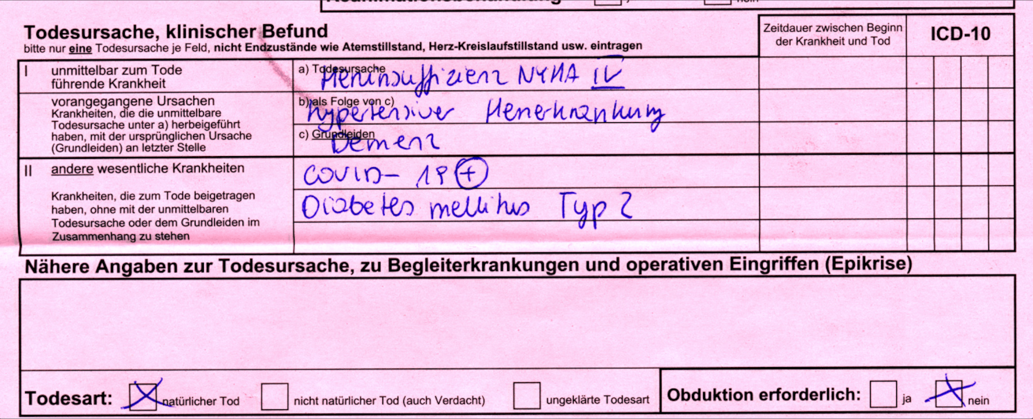 „Ich arbeite als Bestatter und die Totenscheine, zweimal rot und einmal blau, werden in der Häuslichkeit oder im Pflegeheim ausgestellt. Die aus den Krankenhäusern gehen direkt ins Standesamt. Ich benötige den blauen Totenschein, um die Sterbefallanzeige auszufüllen. Manchmal kann ich in die roten, nicht ganz legal, einsehen. Das sind die interessanten. Ich schicke heute noch mal einen mit. Bitte beachten, das Geburtsjahr, im Pflegeheim verstorben! Abschiednahme durch Verwandte und Pflegepersonal!! Kein Hinweis auf Infektion!!! Aber Covid-19.