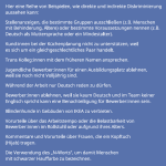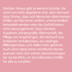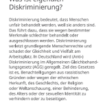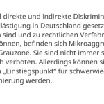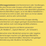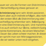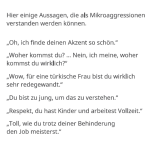 Aus den Screenshots der Broschüre wird ersichtlich, dass zwischen stark diskriminierenden, schlicht unhöflichen und völlig harmlosen Aussagen nicht unterschieden wird. „Während der Arbeit nur Deutsch reden können“, scheint für die meisten Menschen, die in Deutschland arbeiten, eher unter Grundvoraussetzung als unter Verstoß zu fallen. Aber wer ganz selbstverständlich davon ausgeht, dass das Sprechen der eigenen Muttersprache im eigenen Land legitim ist, hat offenbar etwas verpasst. Diese alltägliche Praxis wird in der Broschüre jedenfalls in eine Reihe mit der Diskriminierung von Menschen mit Behinderung gestellt. Aussagen wie „Ich finde deinen Akzent so schön“ oder „Woher kommst du?“ stehen ebenfalls direkt neben Sätzen wie „Wow, für eine türkische Frau bist du wirklich sehr redegewandt“ oder „Toll, wie du trotz deiner Behinderung den Job meisterst“.