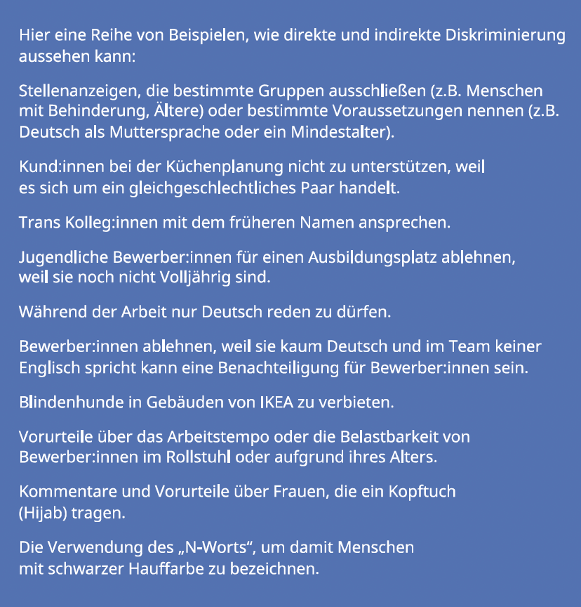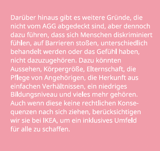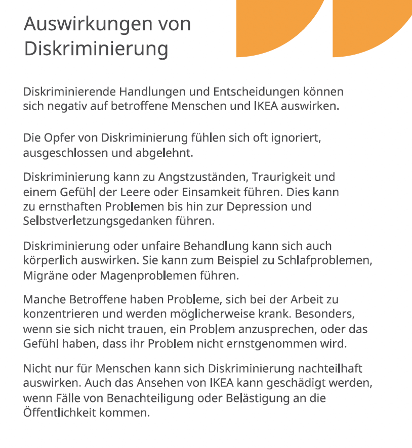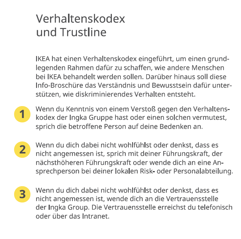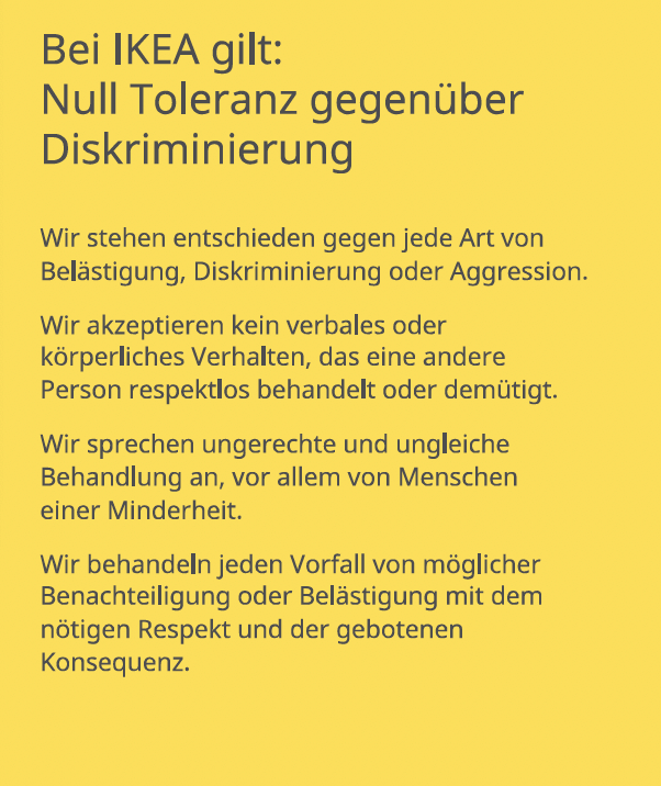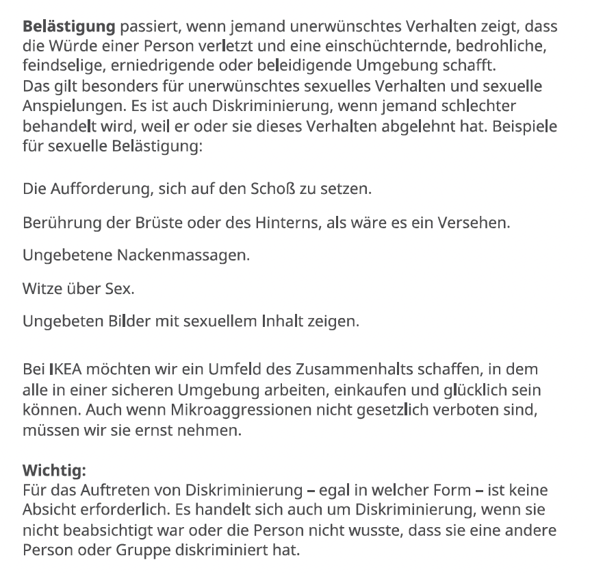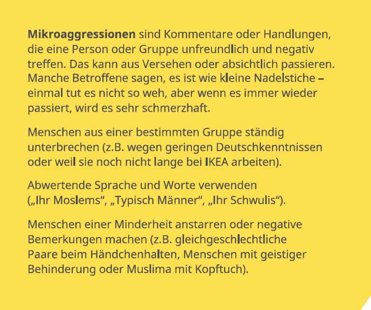 Neben Diskriminierung fallen auch Mikroagressionen in den Bereich „Null-Toleranz“ bei IKEA. „Mikroaggressionen sind Kommentare oder Handlungen, die eine Person oder Gruppe unfreundlich und negativ treffen. Das kann aus Versehen oder absichtlich passieren. Manche Betroffene sagen, es ist wie kleine Nadelstiche – einmal tut es nicht so weh, aber wenn es immer wieder passiert, wird es sehr schmerzhaft“, steht in der Broschüre.