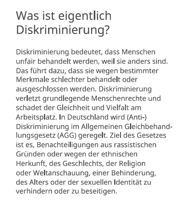 Bunt und in gewohnter „Wir-sind-eine-Familie“-Manier geht es in der Broschüre zunächst um die schöne Vielfalt unserer Gesellschaft. Nach einem klaren Bekenntnis zur „Null-Toleranz“ wird die klassische Definition von Diskriminierung um weitere Merkmale ergänzt: Aussehen, Sprache, Familie oder sozioökonomischer Hintergrund. Und weil diese Merkmale rechtlich nicht geschützt sind, wenn sie zur Sprache kommen, regelt das Unternehmen den Umgang damit selbst.