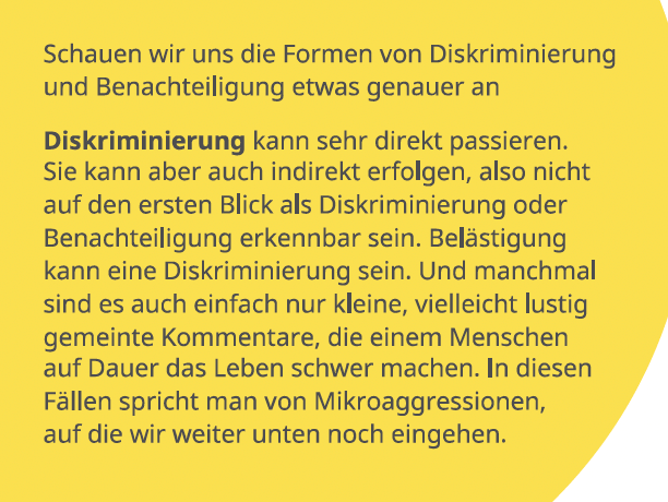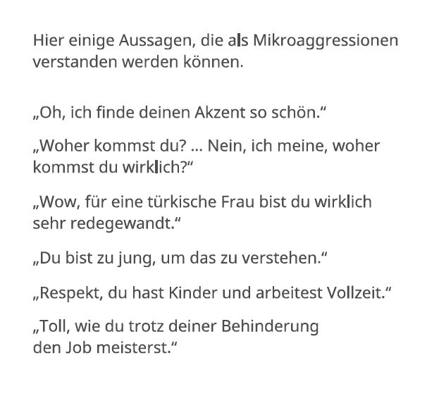 Aus den Screenshots der Broschüre wird ersichtlich, dass zwischen stark diskriminierenden, schlicht unhöflichen und völlig harmlosen Aussagen nicht unterschieden wird. „Während der Arbeit nur Deutsch reden können“, scheint für die meisten Menschen, die in Deutschland arbeiten, eher unter Grundvoraussetzung als unter Verstoß zu fallen. Aber wer ganz selbstverständlich davon ausgeht, dass das Sprechen der eigenen Muttersprache im eigenen Land legitim ist, hat offenbar etwas verpasst. Diese alltägliche Praxis wird in der Broschüre jedenfalls in eine Reihe mit der Diskriminierung von Menschen mit Behinderung gestellt. Aussagen wie „Ich finde deinen Akzent so schön“ oder „Woher kommst du?“ stehen ebenfalls direkt neben Sätzen wie „Wow, für eine türkische Frau bist du wirklich sehr redegewandt“ oder „Toll, wie du trotz deiner Behinderung den Job meisterst“.