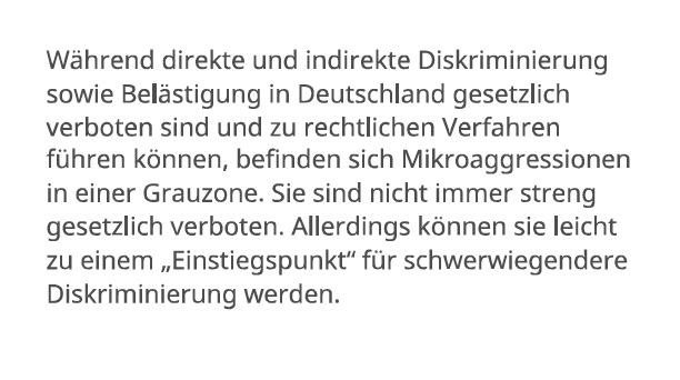 Nun, dass Mikroagressionen nichts Angenehmes sind, ist unbestritten. Und dass sie psychisch belasten können, mag ebenfalls zutreffen. Sie aber mit echter Diskriminierung und Belästigung gleichzusetzen und Mitarbeiter aktiv dazu ermutigen, diese stets den Vorgesetzten zu melden, verlangt viel Kreativität. Denn Mikroaggressionen sind üblich überall dort, wo Menschen miteinander sprechen. In jeder Gruppe und in jeder Gemeinschaft gibt es unterschiedliche Charaktere – adäquate, offene und respektvolle oder auch aggressive, manipulative und respektlose. Wenn ein Mensch erwachsen ist, kann er in der Regel damit umgehen. Für schwere Fälle wie Mobbing etc. gibt es in beinahe jedem großen oder mittelständischen Unternehmen Stellen, an die man sich als Betroffener wenden kann.