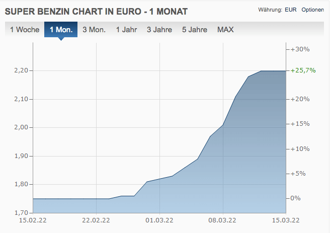 Es ist dem Portal Statista zu danken, dass wenigstens für den Februar 2022 verwertbare Zahlen vorliegen. Der Durchschnittspreis für Superbenzin lag demnach bei 1,79 Euro, also 41 Cent niedriger als heute (2,20 Euro).