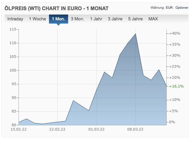 Wenden wir uns nun dem angeblich für den Preisanstieg verantwortlichen Ölpreis zu. Der stieg im Monatsvergleich um 19 Prozent und das bei der teureren Ölsorte Brent (bei WTI sind es 16,1 Prozent, Preis in Euro). Nur für wenige Tage lag er bei einem Plus von über 25 Prozent (Maximum 40 Prozent an einem einzigen Tag).