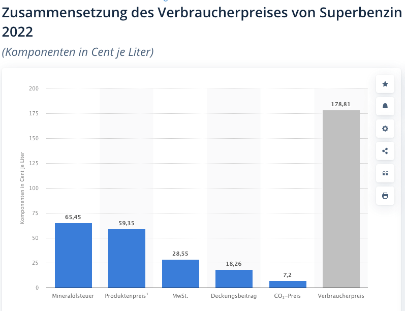 Da wird zum Beispiel der Einkaufspreis mit der CO2-Abgabe und der Mehrwertsteuer summiert (also zwei variable Komponenten mit einer fixen) und der Mineralölsteuer gegenübergestellt, was jede sinnvolle Auswertung unmöglich macht. Dieser unbrauchbare Zahlensalat findet sich in fast sämtlichen Medien.