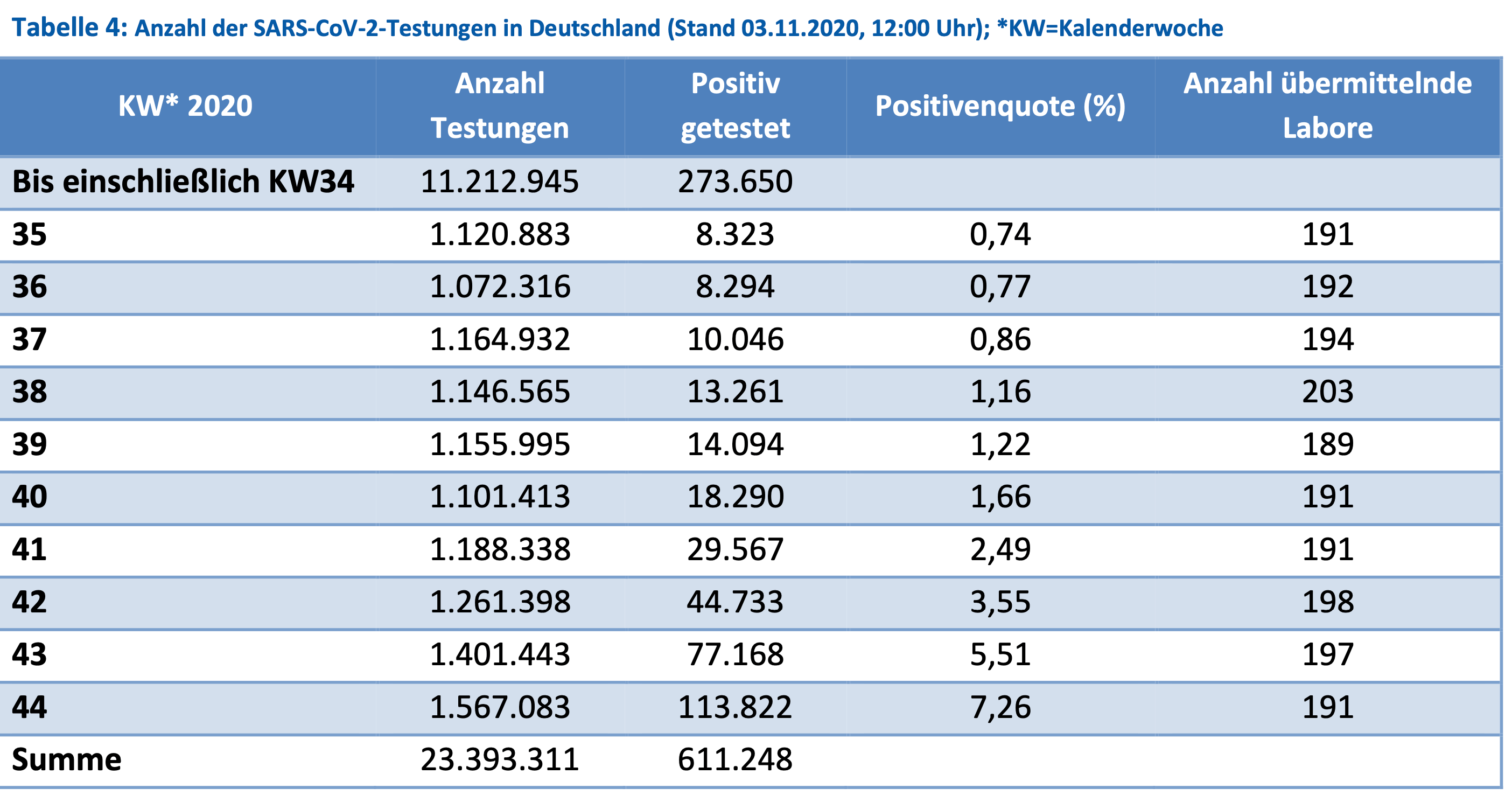 Interessanter als die Zahl der positiv Getesteten ist der Anteil der positiven Fälle an den Tests, den das RKI immer nur Mittwochs in seinen Tagesberichten aufführt. In der aktuellsten gemeldeten Kalenderwoche 44 lag dieser Anteil bei 7,26 Prozent. Das ist fast der zehnfache Wert von Kalenderwoche 35 – aber immer noch unter dem Wert der Kalenderwochen 13, 14 und 15 (23. März bis 12. April). Während früher in den Mittwochs-Tagesberichten des RKI immer alle Kalenderwochen aufgeführt wurden und somit der Kontrast zu den Wochen mit den höchsten Werten im März und April ins Auge stach, so führt das RKI inzwischen die früheren, hohen Werte dort gar nicht mehr auf.