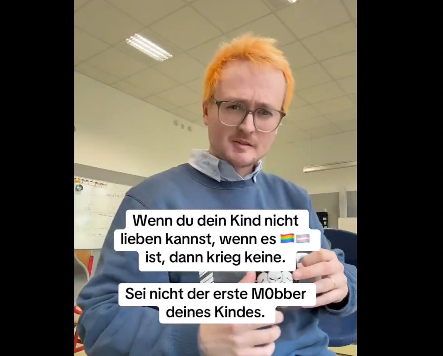 Die Szene auf TikTok beginnt im Flackerlicht einer ganz normalen Schule. Vorne sitzt ein Mann mit blassorangem Haar, akkurat gefärbt wie mit Textmarker, mit runder Brille und hellblauem Pullover über dem Hemdkragen, Trauring am Finger. Er blickt in die Kamera wie in eine Sprechstunde. Dann der Satz, der Eltern schneidet wie Glas: „Sie wollten sprechen wegen Ihres Sohnes. Sie haben keinen Sohn.“ Gemeint ist: Die Tochter „lebt jetzt“ als Junge – und die Mutter soll das gefälligst akzeptieren. Weiter erklärt der Lehrer: Die Schule respektiere, was das Kind wolle; man habe mit ihm gesprochen; es sei „alt genug“, um selbst zu entscheiden, wer es ist; die Mutter solle sich „anfreunden“ – sonst werde sich ihr Kind später von ihr abwenden.