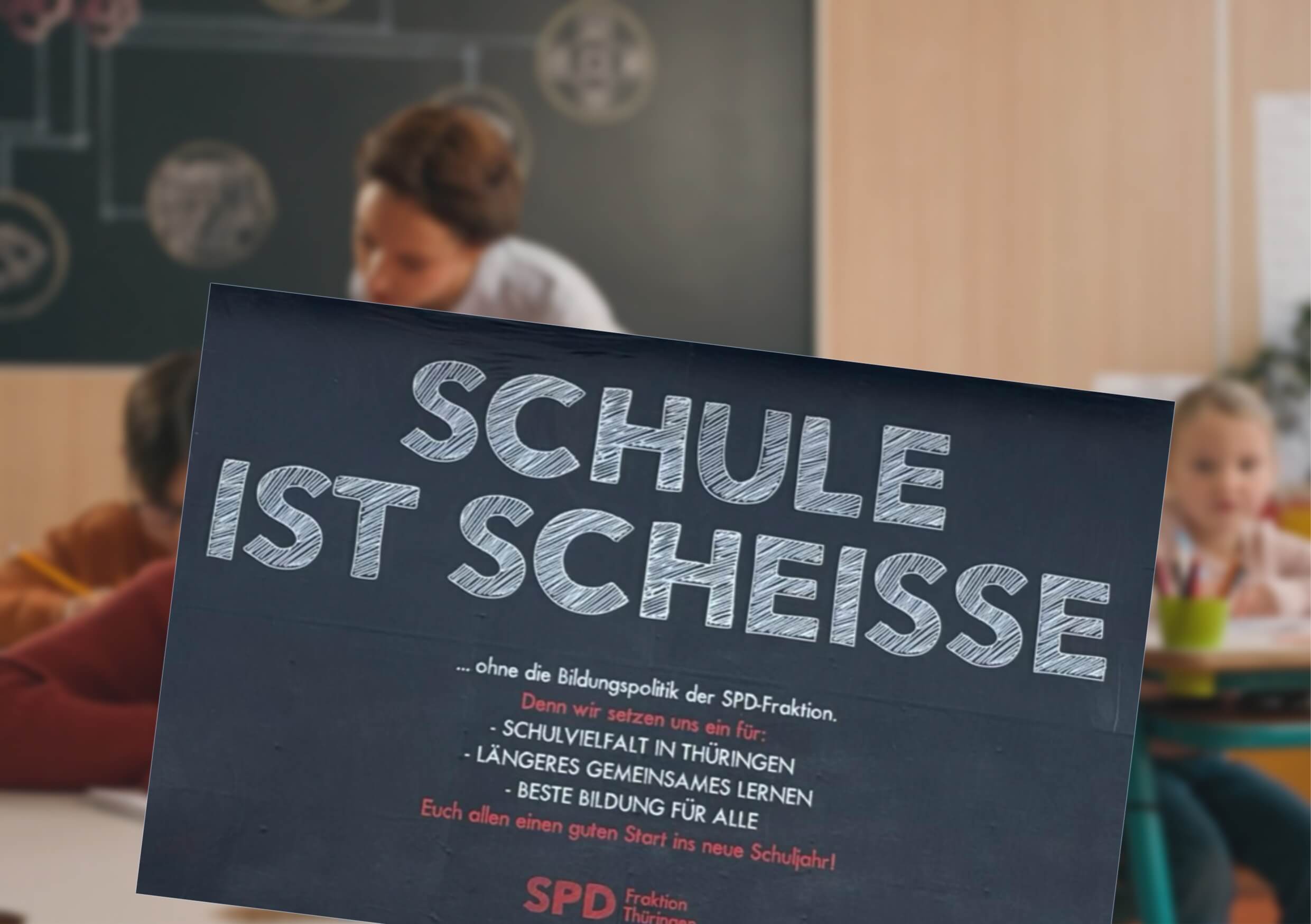 Mit diesem Satz startet die SPD-Fraktion Thüringen in das neue Schuljahr. Nein, das ist kein Witz. Und auch kein bearbeitetes Satirebild. Es ist ein offizielles Plakat. In Erfurt. In anderen Städten. Großflächig, in Kreideschrift auf schwarzem Hintergrund – als wäre es direkt aus einem Klassenzimmer entnommen.