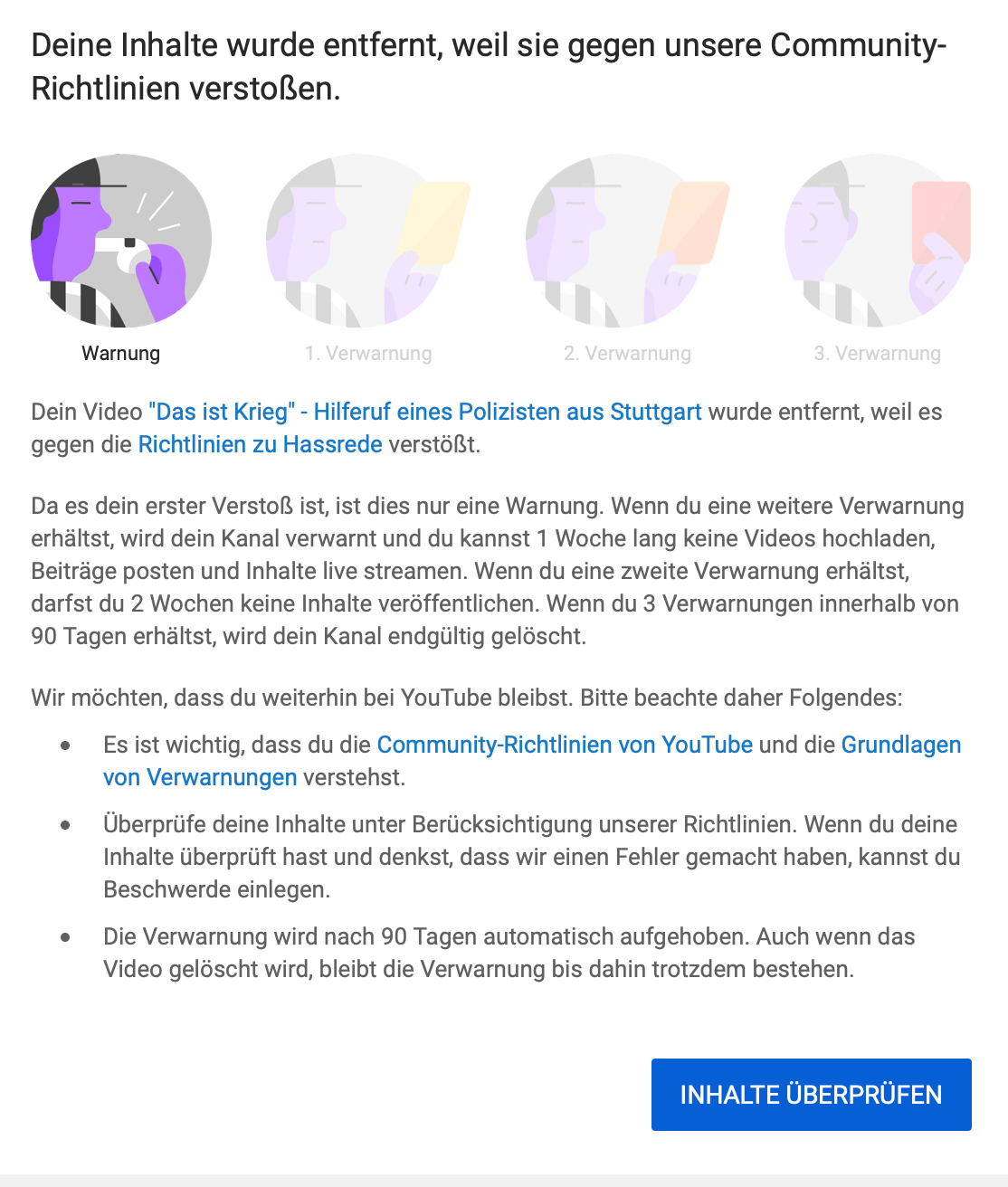 Jetzt hat es youtube gesperrt. Es soll „Hassrede“ sein. Das Netzwerk, das zu google gehört, hat es vom Netz genommen und mir eine Verwarnung erteilt. Die Begründung: „Weil es gegen die Richtlinien zu Hassrede verstößt.“ Und weiter: „Da es dein erster Verstoß ist, ist dies nur eine Warnung. Wenn du eine weitere Verwarnung erhältst, wird dein Kanal verwarnt und du kannst 1 Woche lang keine Videos hochladen, Beiträge posten und Inhalte live streamen. Wenn du eine zweite Verwarnung erhältst, darfst du 2 Wochen keine Inhalte veröffentlichen. Wenn du 3 Verwarnungen innerhalb von 90 Tagen erhältst, wird dein Kanal endgültig gelöscht. Wir möchten, dass du weiterhin bei YouTube bleibst. Bitte beachte daher Folgendes:“ Es folgt eine Belehrung.