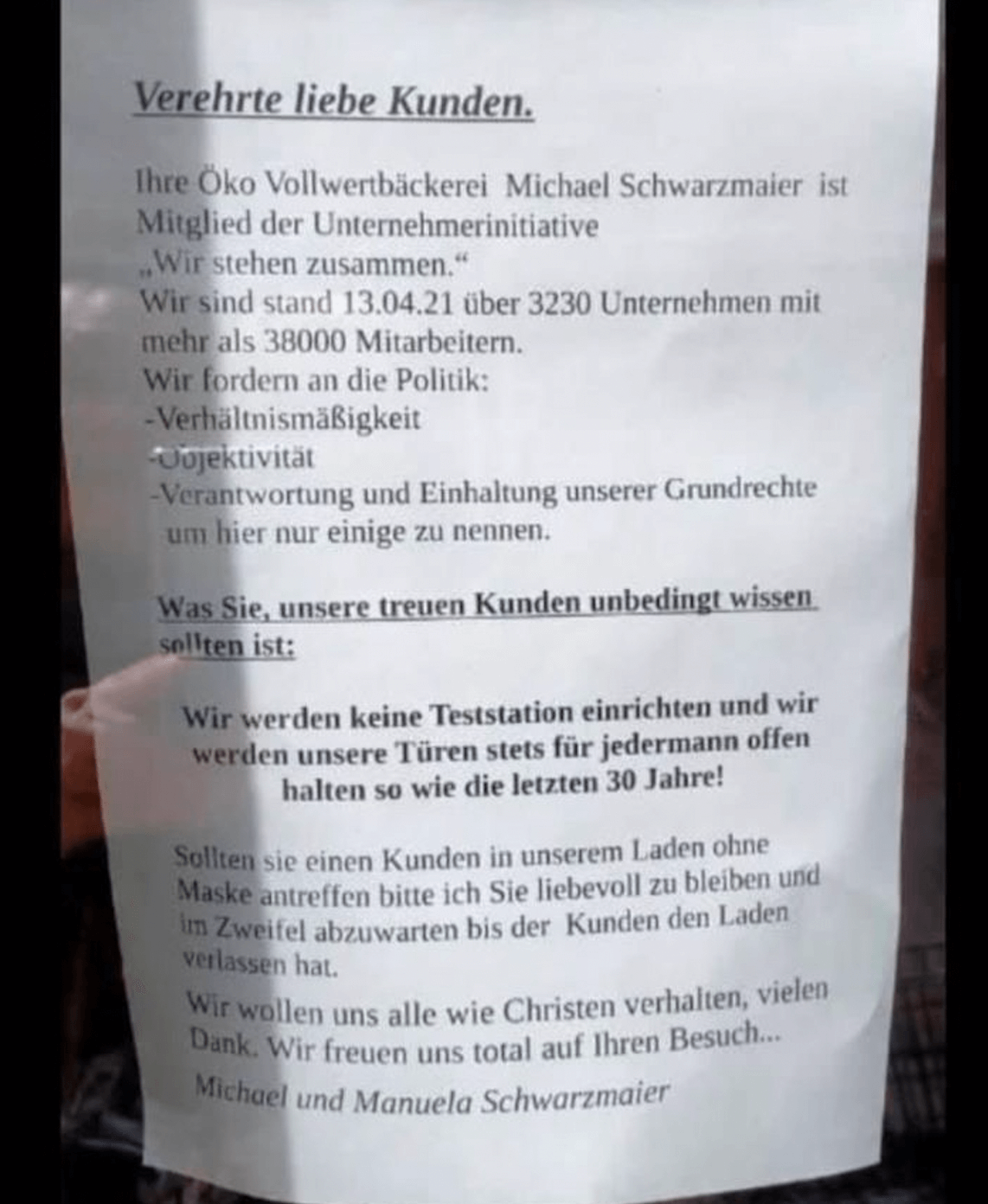 „Wir haben keine Coronakrise, sondern eine Maßnahmenkrise“, erklärt Zahnarzt Dr. Georg Kustermann in seinem Video. Das Video des 58-Jährigen aus Kolbermoor wurde 310 000 mal aufgerufen. „Runter von der Couch“, bittet ein Maschinenbauer seine Kollegen. Biobäcker Michael Schwarzmaier appelliert an seine Kollegen: „Wir müssen mutiger werden! Nur den Mutigen die Zukunft.“ Die Coronapolitik hat anfangs Einzelhandel, Gastronomie, Tourismus und Kultur besonders hart getroffen. Jetzt ist die „Maßnahmenkrise“ auch in Produktion und Handwerk angekommen, berichten die Unternehmer. Lieferungen kommen nicht. Material und Waren fehlen.