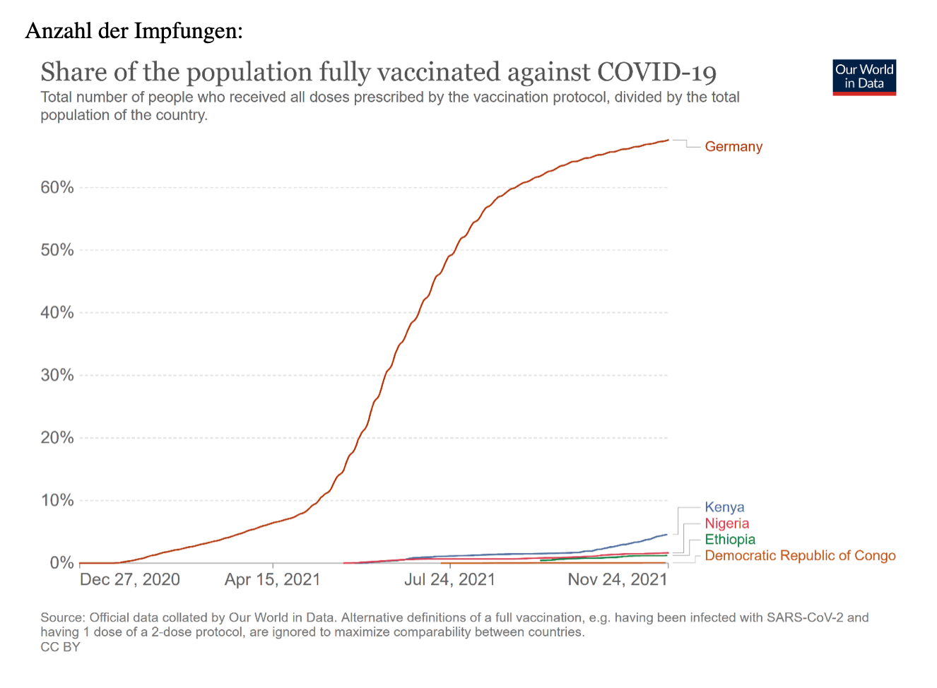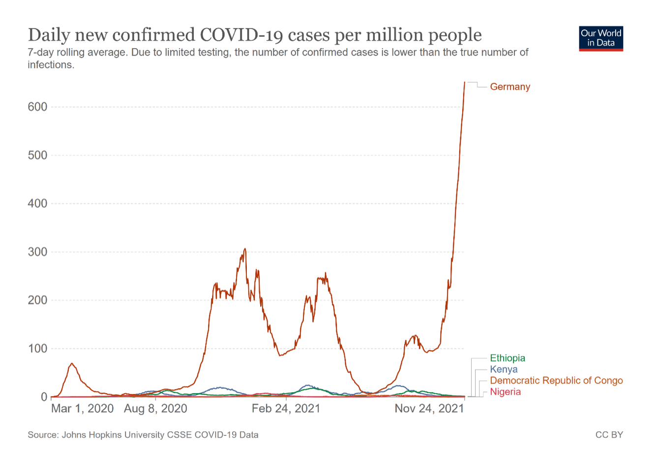 Anhand der afrikanischen Länder Äthiopien, Kenia, Nigeria und der Demokratischen Republik Kongo wird in den folgenden Grafiken der Unterschied in den Inzidenzzahlen und der Impfquote im Vergleich zu Deutschland dargestellt. (Stand 25.11.2021, Quelle: Ourworldindata). Anzahl der Fälle: