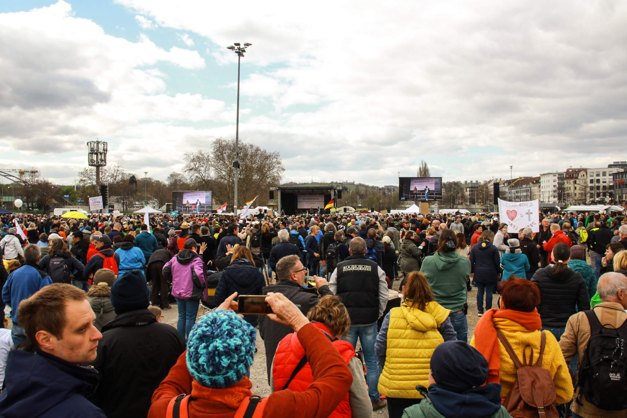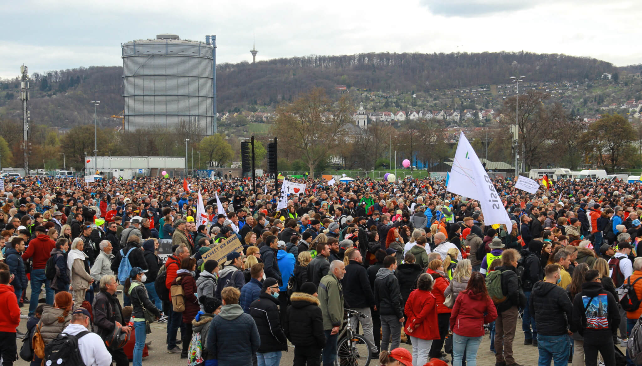 Rund 15.000 Menschen aus ganz Süddeutschland bis hin zu Frankfurt, Darmstadt und Wiesbaden versammelten sich unter dem Motto, das Michael Ballweg ausgab: „Wir sind keine Anti-Corona-Demonstration, sondern wir demonstrieren für unsere Grundrechte, das Recht auf Versammlungsfreiheit, auf Berufsfreiheit und das Recht auf Bildung.“ Wie auf anderen „normalen“ Demos wurde das von prominenten Rednern auf der Bühne ausgeführt, in diesem Fall waren es Ralf Ludwig, Anselm Lenz und Thomas Berthold. Auch eine Künstlerin (die österreichische Regisseurin Catharina Roland), ein Unternehmer (der Stuttgarter Fitnessstudiobetreiber Firat Polat) und ein Pädagoge (Vincent Dietz, „Pädagogen für Aufklärung“) konnten ihre spezifische Sichtweise vor der riesigen Menschenmenge darlegen, die bunter gemischt nicht hätte sein können („die Mitte der Gesellschaft“?), in der es aber keine sichtbaren Zeichen von Rechtsextremismus gab. So viel ergänzend zum Augenzeugen-Bericht über die Demo, der heute Nacht hier veröffentlicht wurde.