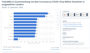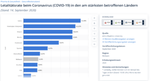 PS: Noch ein Beispiel dafür, wie leicht man mit Zahlen manipulieren kann. Nimmt man etwa die Letalitätsrate bei Covid-19, also die Fallsterblichkeit, so ist diese in Deutschland noch höher als in den USA, wie etwa diese Graphik von Statista zeigt: