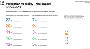 Dass die Ängste überzogen sind, zeigen aber nicht nur solche subjektiven Beobachtungen. Dies belegt auch etwa eine Studie von KEKST CNC, einem führenden internationalen Beratungsunternehmen. Sie zeigt, dass die Menschen glauben, es habe viel mehr Infizierte und Todesfälle gegeben, als dies in Wirklichkeit der Fall ist. So glaubten etwa die Deutschen im Juli, dass elf Prozent der Menschen eine Infektion haben oder hatten: 46 Mal so viele, wie in Wirklichkeit. Noch größer das Missverhältnis bei den Todesfällen: Drei Prozent der Bevölkerung seien am Corona-Virus gestorben, so die Annahme. Das sind 300 Mal so viele, wie in Wirklichkeit – zu der gehört auch, dass Bestatter in Deutschland Kurzarbeit anmelden mussten (siehe hier).