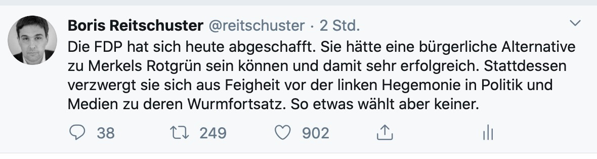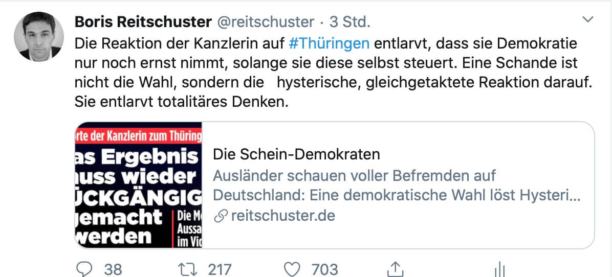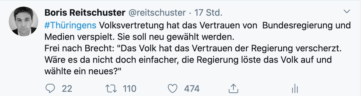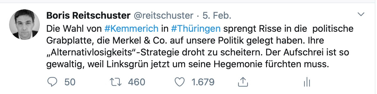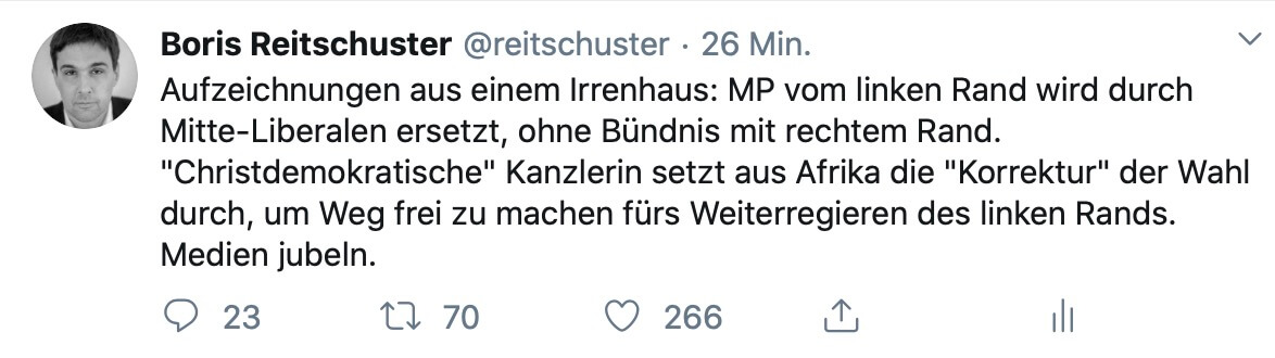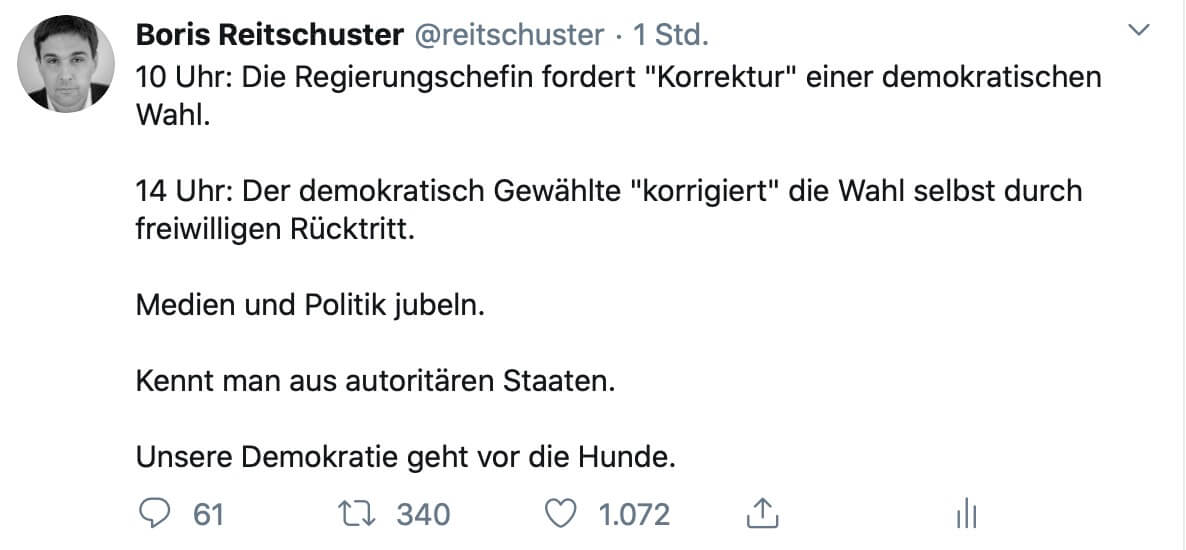 P.S.: Eine Leserin schrieb mir:„Damit hat sich eine totalitäre im Internet und auf den Straßen hetzende und Kemmerich mit Gewaltaktionen drohende Meute – unterstützt von Politikern, die über ihren Eigeninteressen alle demokratischen Ideen zu verraten bereit waren – einen enormen Sieg eingefahren. Eine Katastrophe für die FDP, von der zahlreiche liberale Wähler nun zur AfD wechseln werden. Aber noch fataler: Seit 1945 vermutlich eine der schwärzesten Stunden der Bundesrepublik Deutschland.“