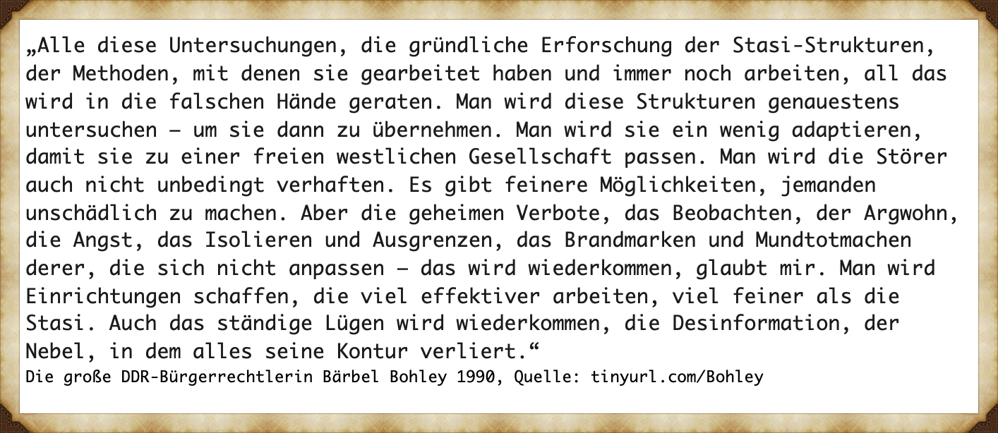 Weil das heute so viele nicht mehr wissen, hier noch einmal eine Betonung des Selbstverständlichen: Die Meinungen von Gastbeiträgen geben nicht meine Meinung wieder. Im konkreten Fall bin ich immer sehr skeptisch DDR-Vergleichen gegenüber. So sehr ich ansatzweise das Denken und die Methoden der DDR wieder erkenne, so sehr verwehre ich mich gegen eine Gleichsetzung. Die ist von meinem Kollegen auch nicht beabsichtigt, denke ich – er möchte nur drastisch auf die Gefahren aufmerksam machen. Und ich finde: Das ist sein gutes Recht.